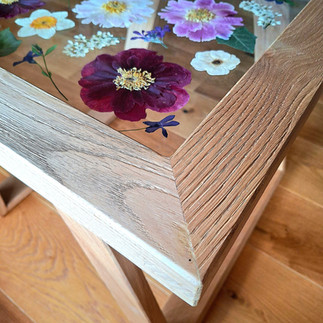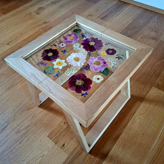 Květinový stolek je vlastně takové rozšíření našich květinových obrazů. Korpus stolku je vyrobený z poctivého masivního dřeva. Tentokrát jsme sáhli po drásaném dubu, který je, jako u nás vždy, ošetřený pouze přírodním olejem. Nožky jsou pro lepší stabilitu lehce zkosené a ze spodu opatřené gumovými polepy, takže nekloužou po podlaze. Deska stolku je tvořena dvěma silnými skleněnými deskami, které jsou bezpečně zakotvené v horním rámu stolku. No a mezi sklem jsou již tradičně vložené vylisované květiny. Jako by se vznášely v prostoru. Jsou nalepené na spodní skleněnou desku a zakryté vrchní skleněnou deskou, takže se při manipulaci se stolkem nepohnou a jsou chráněné proti prach nebo poškození.